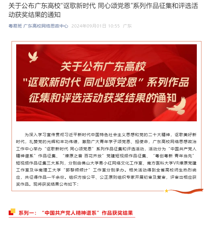 为深入学习宣传贯彻习近平新时代中国特色社会主义思想和党的二十大精神,讴歌美好新时代,礼赞党的光辉和丰功伟绩,激励广大青年学子颂党恩、担使命。近日,广东高校网络思想政治工作中心举办“讴歌新时代 同心颂党恩”系列作品评选活动圆满落下帷幕,在孙爱真教授的精心指导下,管理学院张鑫浩、陈婕、郑铱桦、傅美婷、王雪婷学生团队的作品“品悟红色信仰——从系好红布带开始”从一千余份作品中脱颖而出,在“中国共产党人精神谱系”作品征集中,以宣讲视频的形式,获得三等奖。