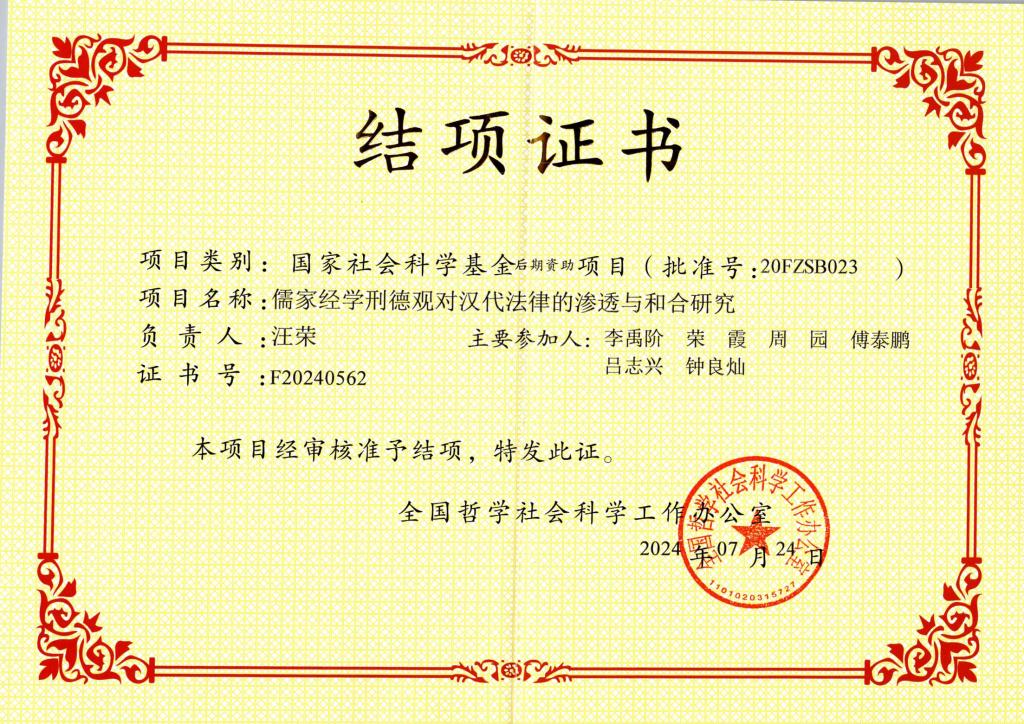 近日,全国哲学社会科学工作办公室公布了2024年6-7月国家社科基金后期资助项目结项情况,经专家鉴定,我校马克思主义学院汪荣教授主持的国家哲学社会科学基金后期资助项目《儒家经学刑德观对汉代法律的渗透与和合研究》(项目编号:20FZSB023)顺利通过结项验收。项目成果为30万字的专著,拟于2025年由人民出版社出版。该项目取得阶段性成果核心期刊论文8篇,课题组主要成员为李禹阶、荣 霞、吕志兴、周园、傅泰鹏、钟良灿。