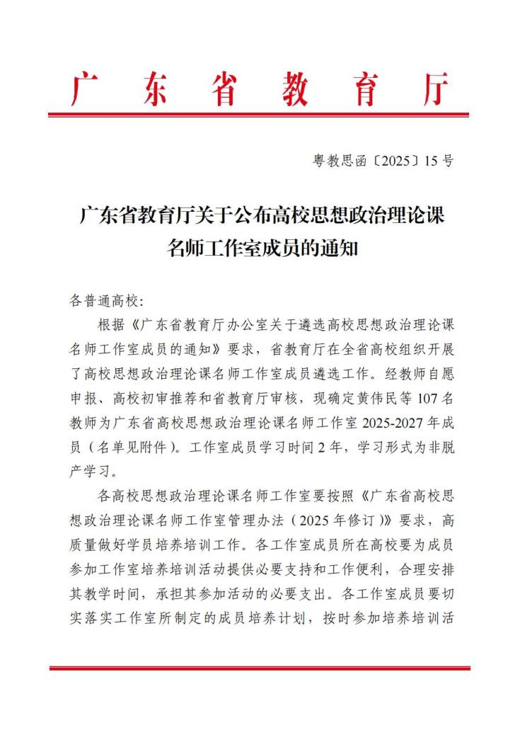 7月21日,广东省教育厅公布2025-2027年高校思想政治理论课名师工作室成员名单。3044am永利集团官网马克思主义学院三位青年教师成功入选。其中,蔡少燕博士入选“沈成飞名师工作室”成员,何香明博士入选“解丽霞名师工作室”成员,王婕博士入选“关锋名师工作室”成员。