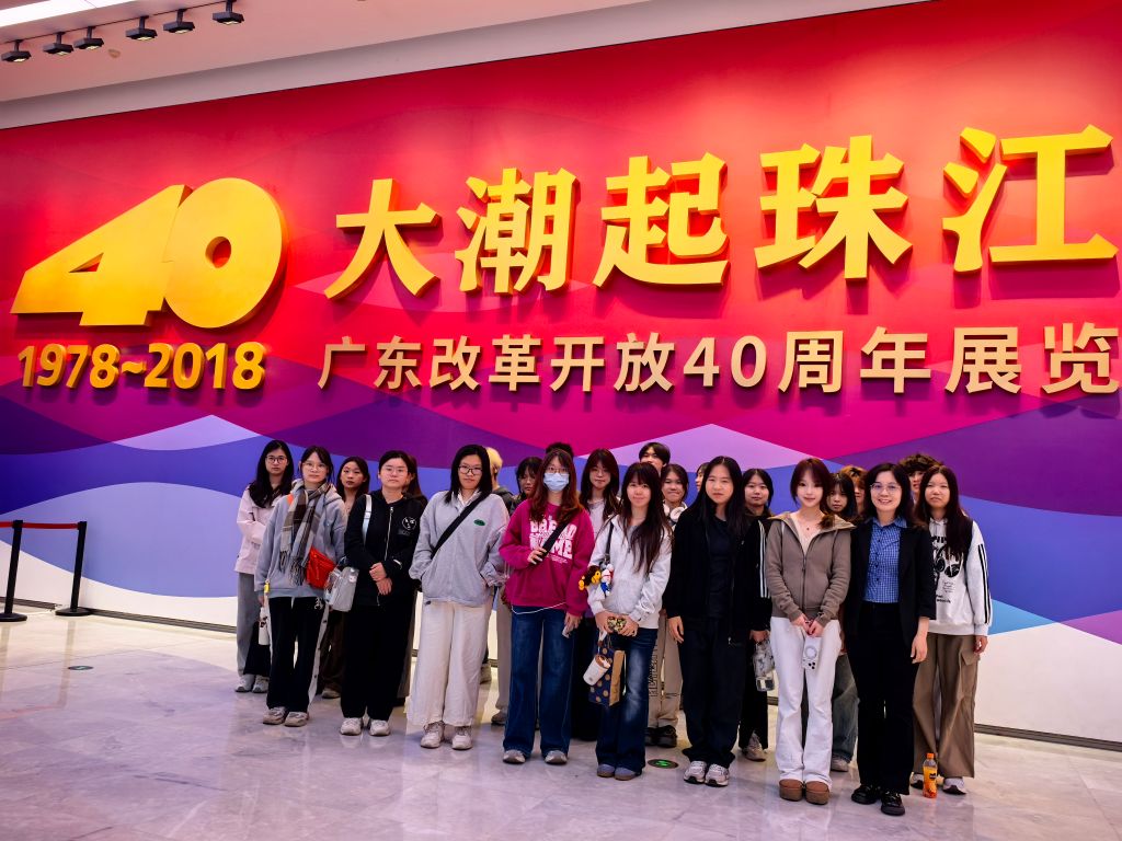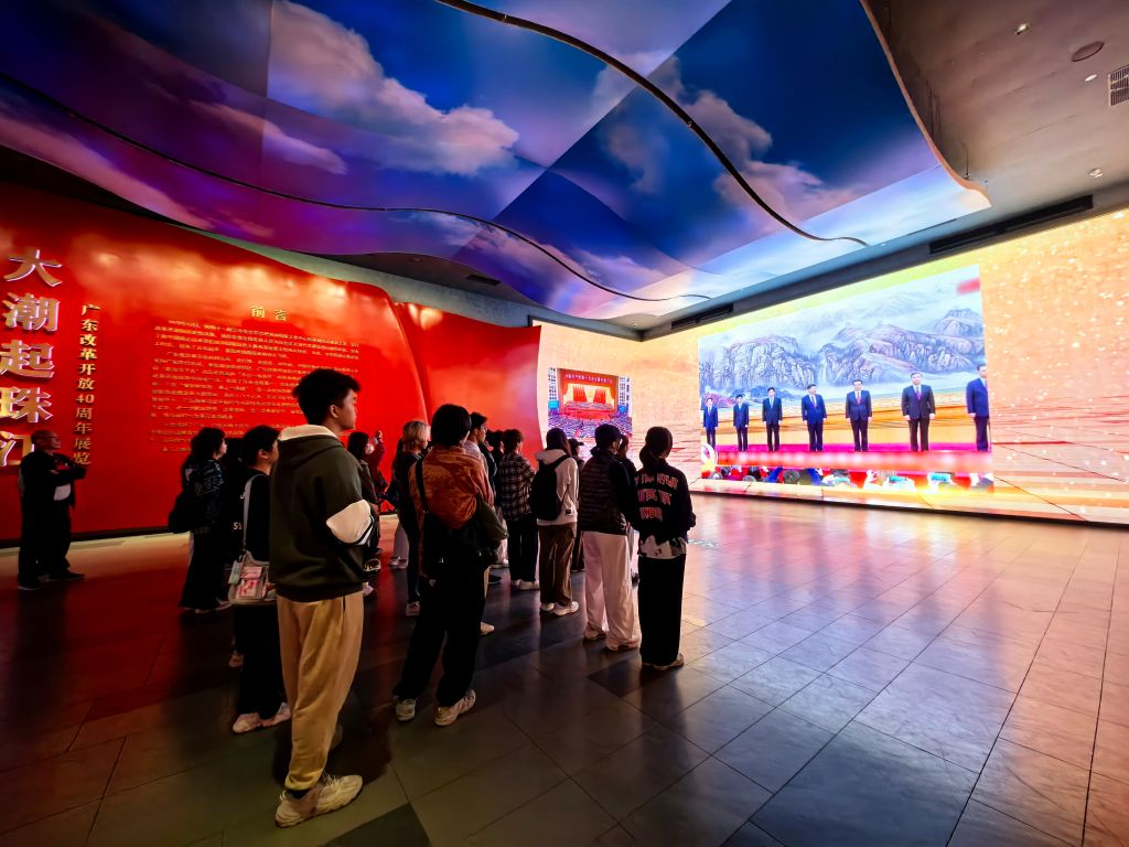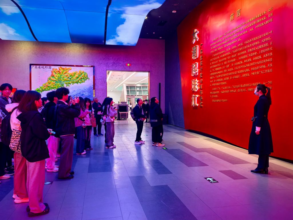 在讲解员引导下,师生系统参观了“大潮起珠江-广东改革开放40周年展览”。展览以丰富史料、实物与多媒体形式,生动展现了广东改革开放40年的壮阔历程和辉煌成就。从序厅的主题巨墙,到“敢为人先 勇立潮头”“增创优势 砥砺前行”“走在前列 当好窗口”等展区,师生在历史场景中重温改革足迹,深入理解解放思想、实事求是的思想路线,体会时间就是金钱,效率就是生命的时代内涵,感悟新时代广东在创新驱动与粤港澳大湾区建设中的战略实践。