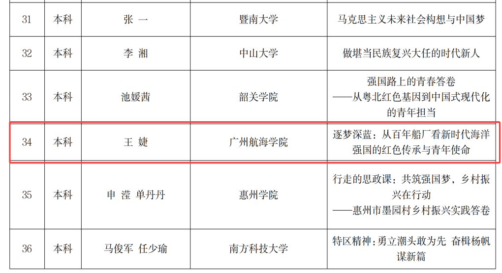 近日,广东省教育厅发布了2025年全省大中小学思政课一体化教学展示交流活动获奖结果,马克思主义学院王婕老师凭借课例《逐梦深蓝:从百年船厂看新时代海洋强国的红色传承和青年使命》荣获二等奖,这一成果充分展现了马院思政课教学的卓越水平,是马院“红帆”思政品牌建设取得的又一标志性突破。