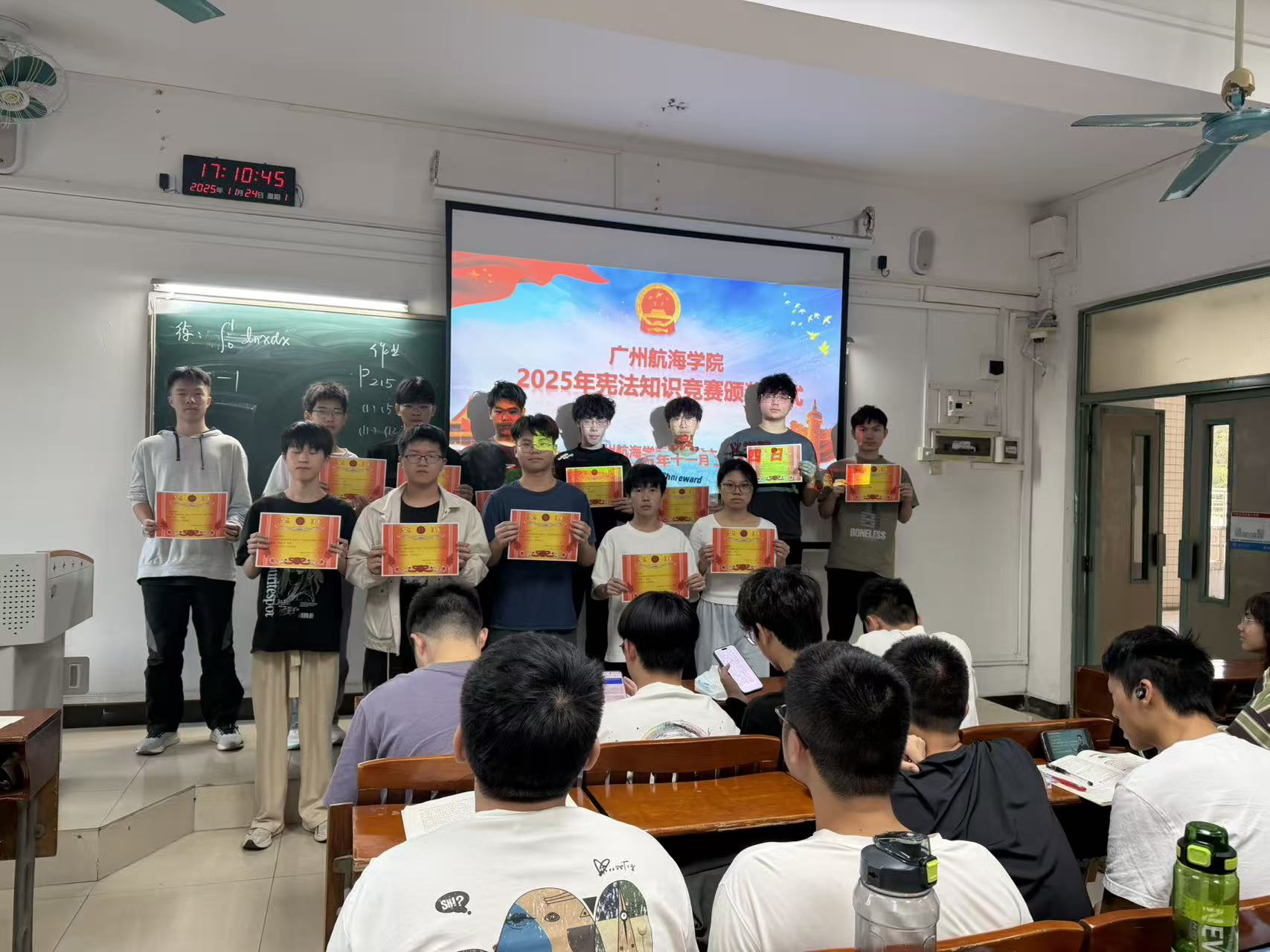 马克思主义学院发挥学科优势,采用多种形式,以“思想道德与法治”课堂教学为载体,面向本学期开设“思想道德与法治”课程的2025级在校学生,在课堂现场通过网络教学平台学习通,积极开展学习宣传贯彻习近平法治思想系列活动,包括宪法晨读、宪法知识竞赛等,在全校形成尊法学法守法用法的良好氛围。学院对竞赛成绩优异的同学进行表彰,颁发荣誉证书,由“思想道德与法治”课任课教师以教学班为单位分别举行了简短的颁奖仪式。同学们纷纷表示今后要进一步努力学习习近平法治思想和宪法知识,践行新时代法治精神,做一名尊法学法守法用法的新时代大学生。