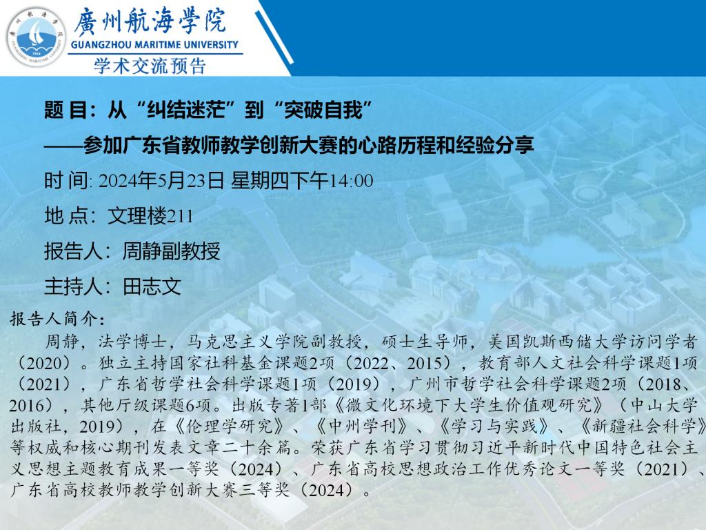 学术讲座预告:周静《从“纠结迷茫”到“突破自我” ——参加广东省教师教学创新大赛的心路历程和经验分享》